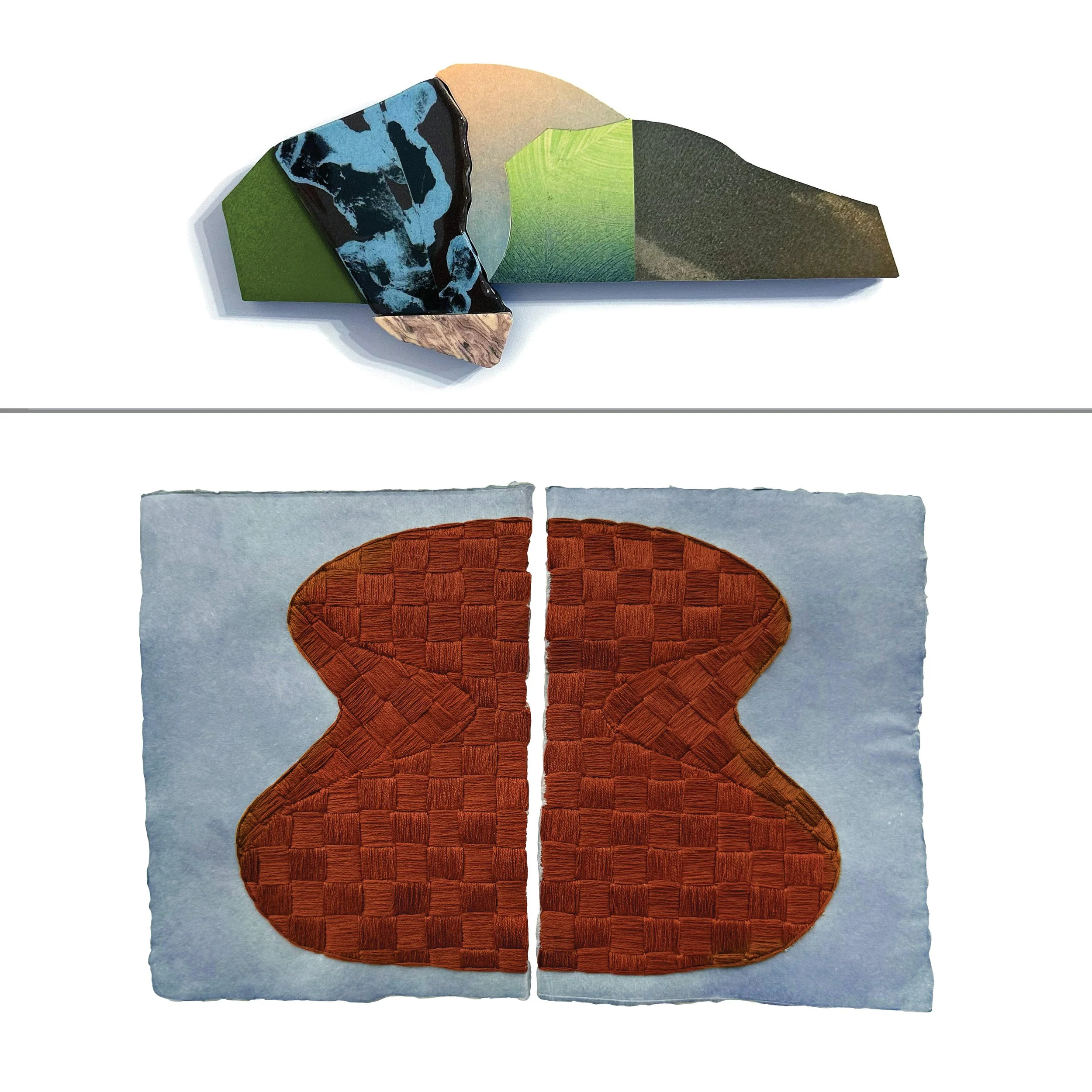 In Material Attention, Lucy Holtsnider and Nora Schuchat highlight their work with their hands; stitching thread through paper, printing and cutting gradients, arranging ceramic and wood, what happens when you stay with a material long enough to really understand it. Their pieces come from repetitive, meditative processes: layering, pairing, building up forms that shift between geometric precision and organic flow. Schuchat pairs strong thread with delicate paper to explore contradictions—tension and ease, perfection and mess—that mirror the emotional complexity of motherhood, stitching a single color of thread in different directions to make light itself into a physical material. Holtsnider starts outdoors observing color and light, then translates those experiences into monotype prints on a letterpress that she methodically cuts and combines with ceramic and wood, pushing back against the speed of digital culture through hands-on trial and error. Both artists find meaning in the imperfect, irreplicable trace of human presence—in work that takes time, care, and sustained material attention, asking viewers to look slowly with the same patience they bring to making.