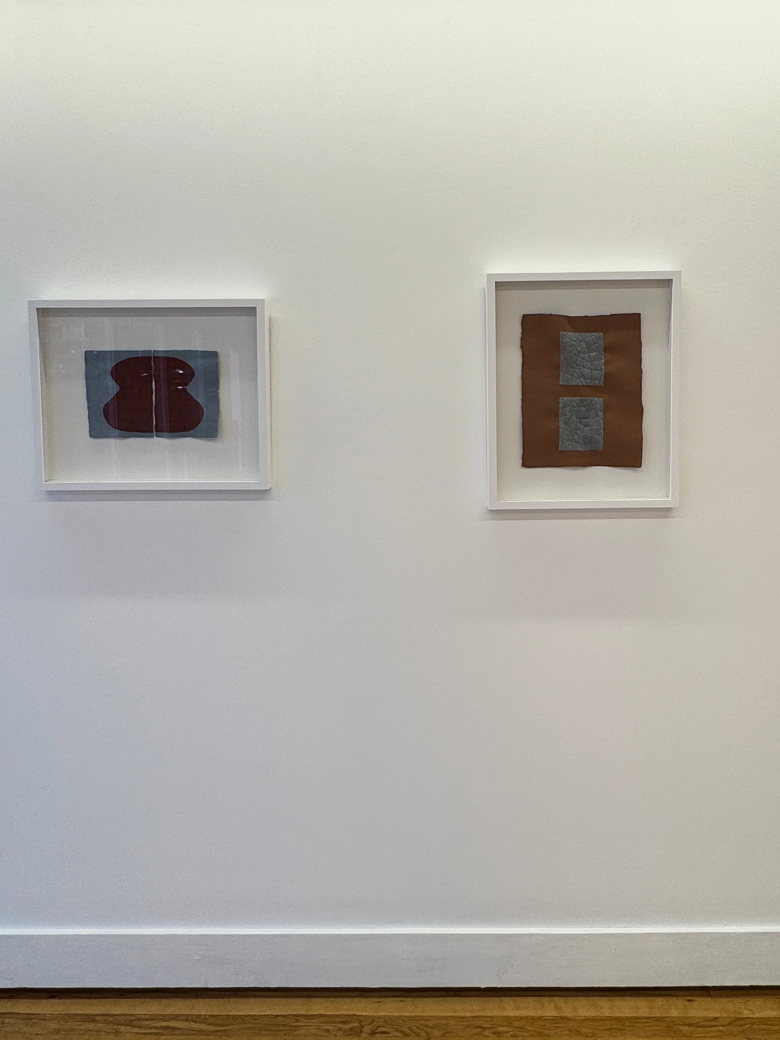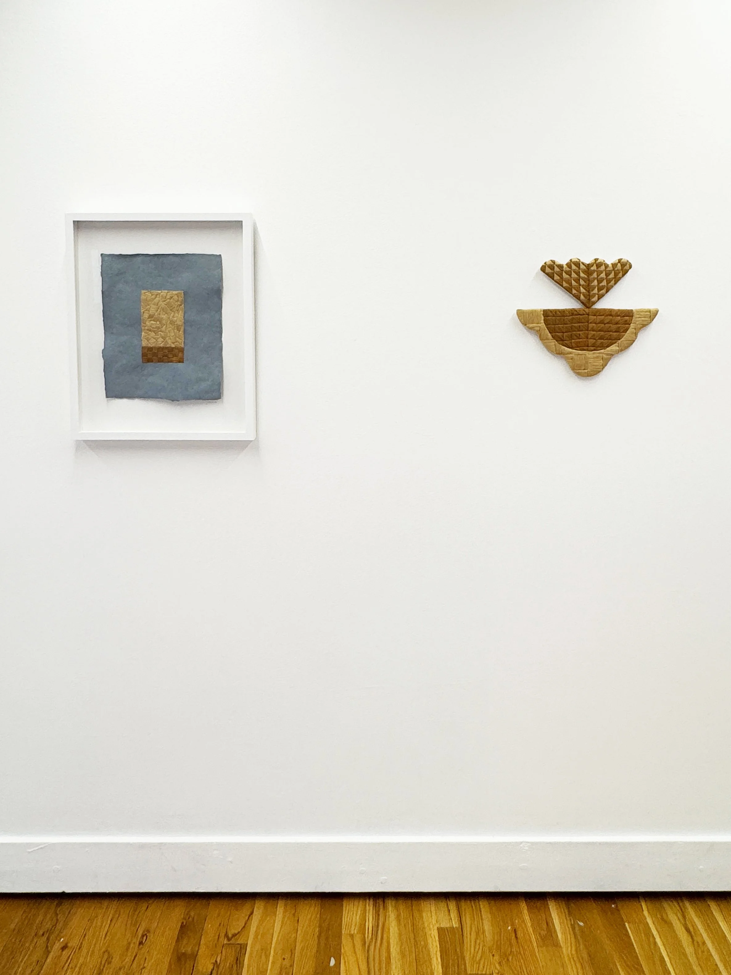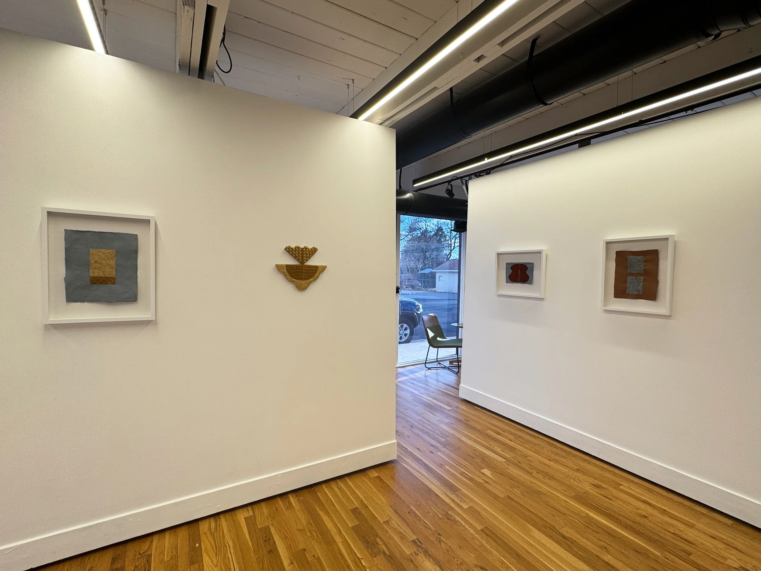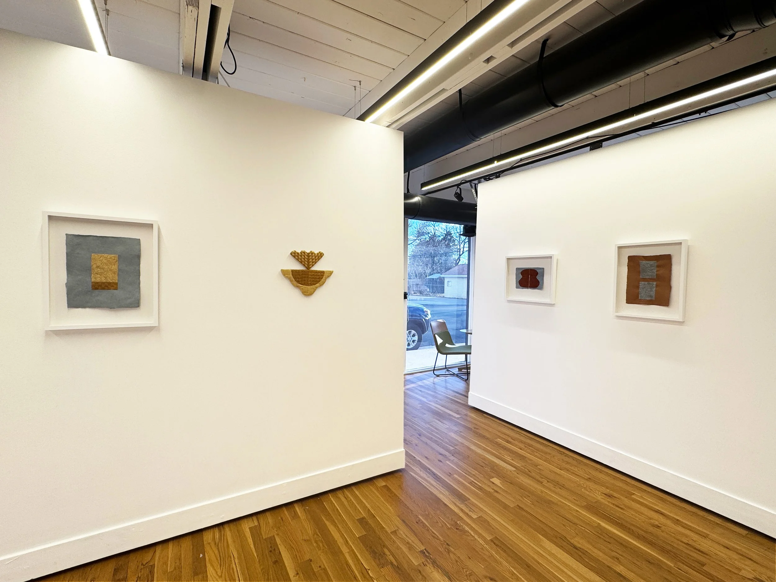 In Material Attention, Lucy Holtsnider and Nora Schuchat highlight their work with their hands; stitching thread through paper, printing and cutting gradients, arranging ceramic and wood, what happens when you stay with a material long enough to really understand it. Their pieces come from repetitive, meditative processes: layering, pairing, building up forms that shift between geometric precision and organic flow. Schuchat pairs strong thread with delicate paper to explore contradictions—tension and ease, perfection and mess—that mirror the emotional complexity of motherhood, stitching a single color of thread in different directions to make light itself into a physical material. Holtsnider starts outdoors observing color and light, then translates those experiences into monotype prints on a letterpress that she methodically cuts and combines with ceramic and wood, pushing back against the speed of digital culture through hands-on trial and error. Both artists find meaning in the imperfect, irreplicable trace of human presence—in work that takes time, care, and sustained material attention, asking viewers to look slowly with the same patience they bring to making.